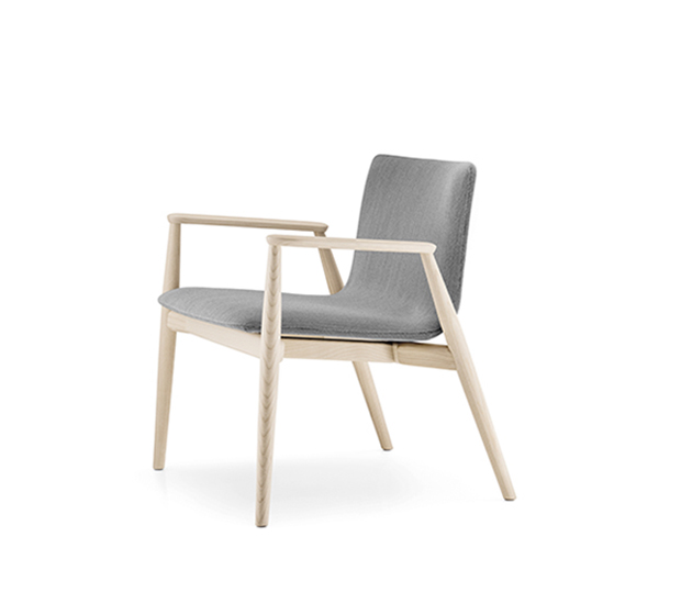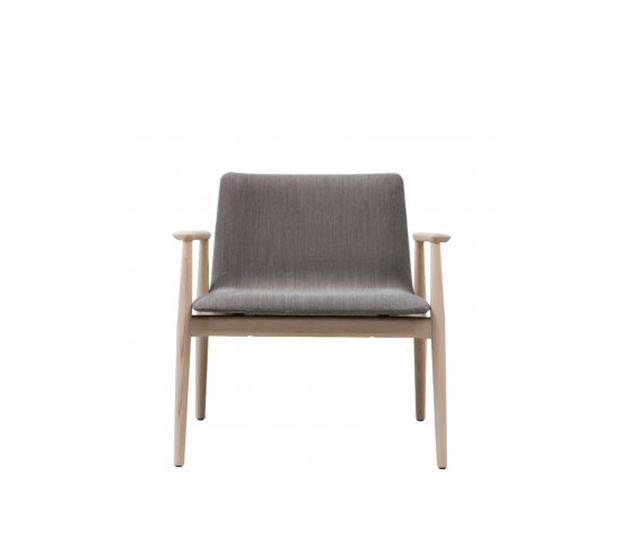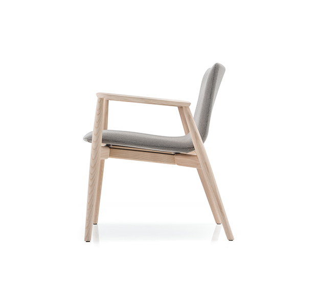Fauteuil lounge avec bras. Assise et dossier rembourrés, structure en frêne massif.