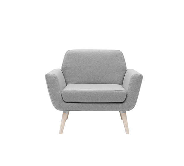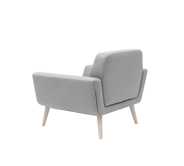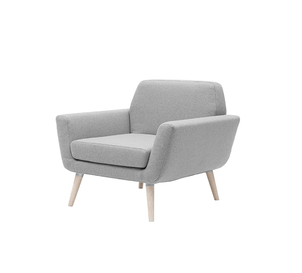 Fauteuil lounge avec bras. Assise et dossier rembourrés, structure en frêne.