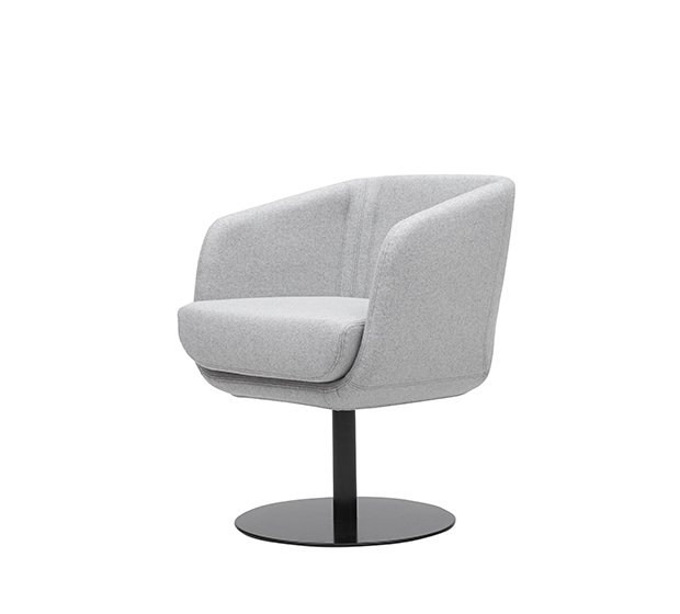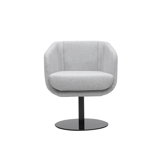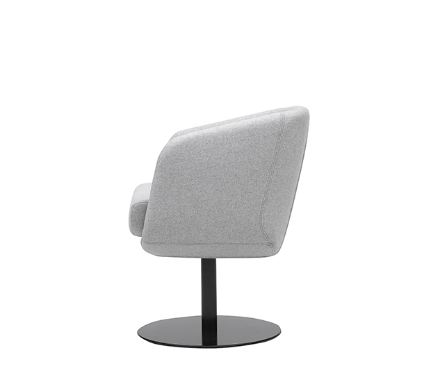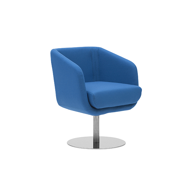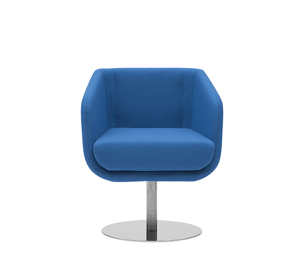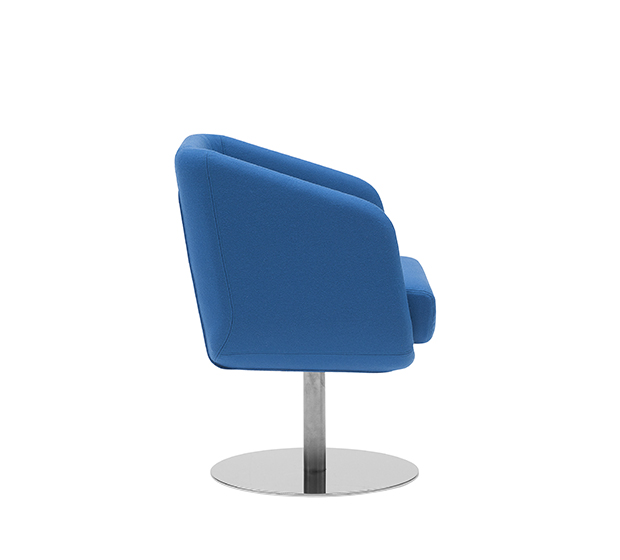 Fauteuil avec bras à base centrale pivotante. Assise et dossier rembourrés, structure en acier poli ou peint.