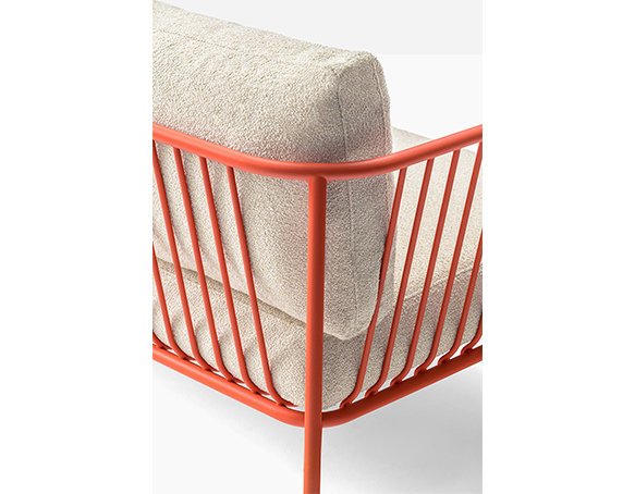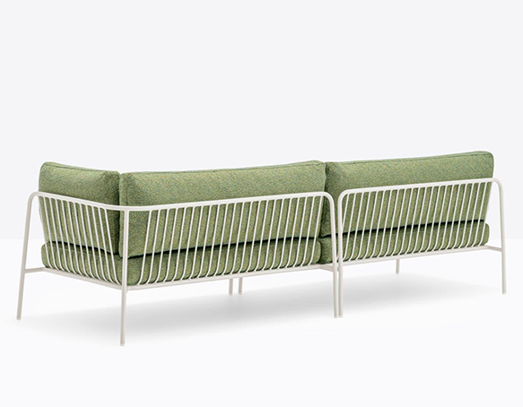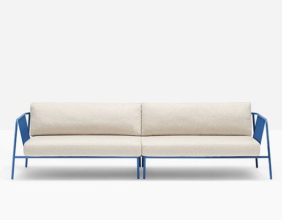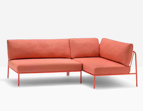Canapé sectionnel pour l’extérieur. Structure en tube d’acier époxy. Coussins de l’assise en polyuréthane, coussins du dossier en polyester. Les coussins sont protégés par une housse imperméable et recouverts de tissu d’extérieur.