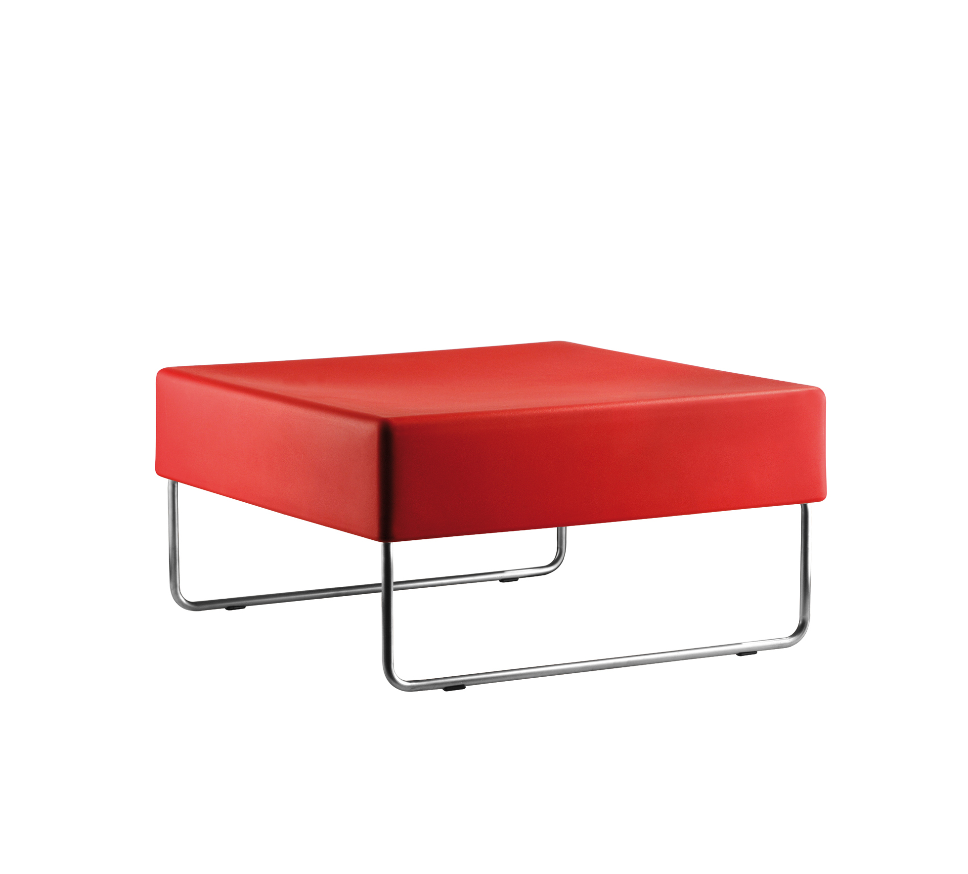 Fauteuil modulaire à base traîneau. Élément pouf, assise en polyéthylène, structure tubulaire ronde en acier brossé. Paire d’unités de liaison incluse.