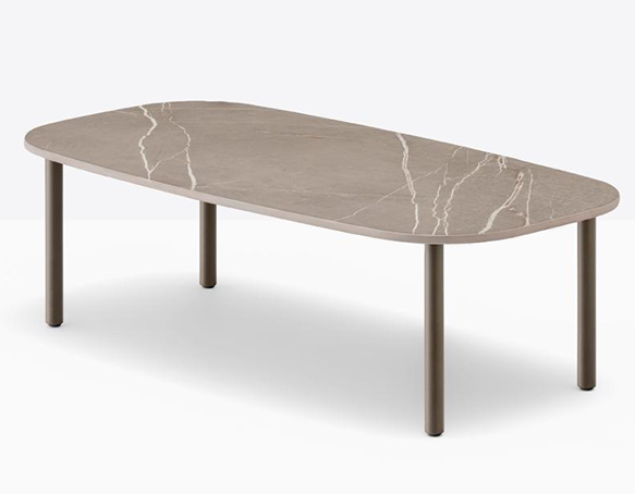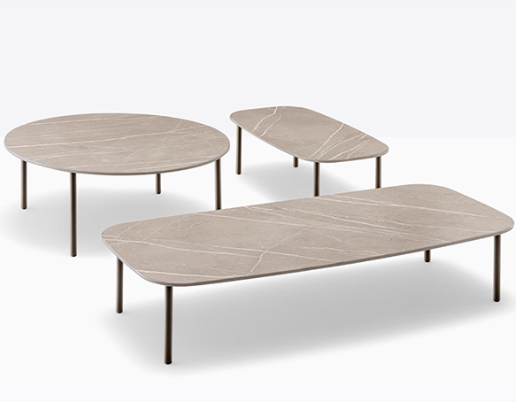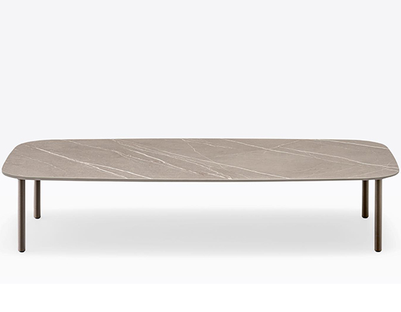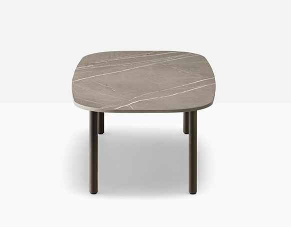 Table basse disponible en deux hauteurs différentes. Base à quatre pattes en aluminium. Plateau aux coins arrondis en stratifié ou avec finition antitaches Fenix. Certains finis sont adaptés à l’usage extérieur.