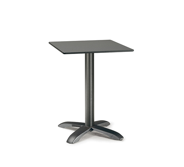 Base de table en fonte à colonne centrale ronde. Structure à 4 pieds chromés, brossés ou peints. Hauteur standard. Sous-pattes ajustables incluses.