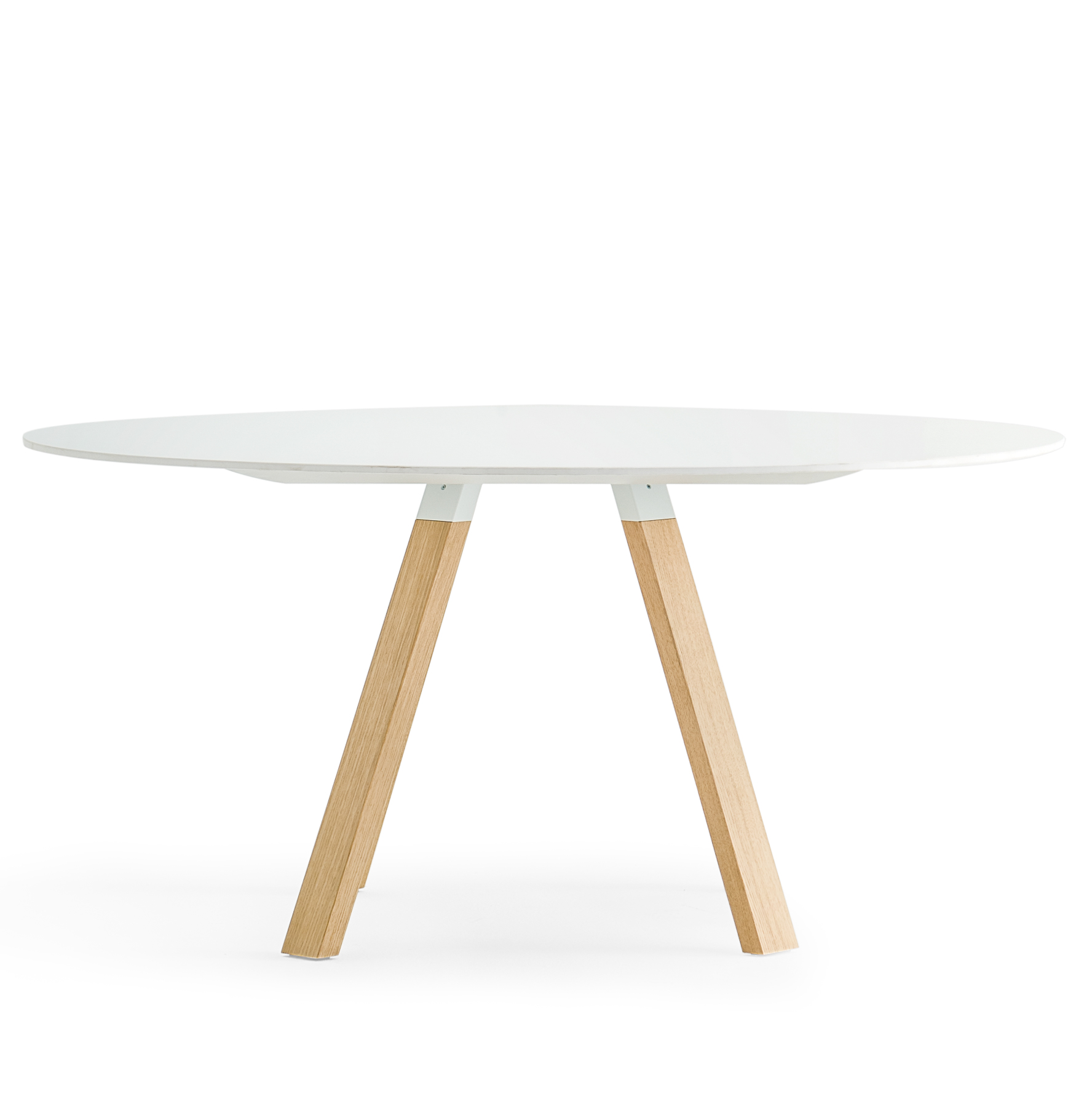 Table ronde avec plateau laminé, structure en aluminium et pattes en acier. Hauteur standard.