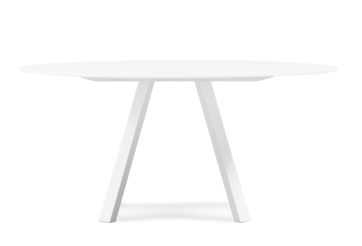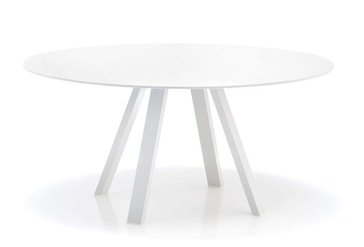 Table ronde avec plateau laminé, structure en aluminium et pattes en acier. Hauteur standard.