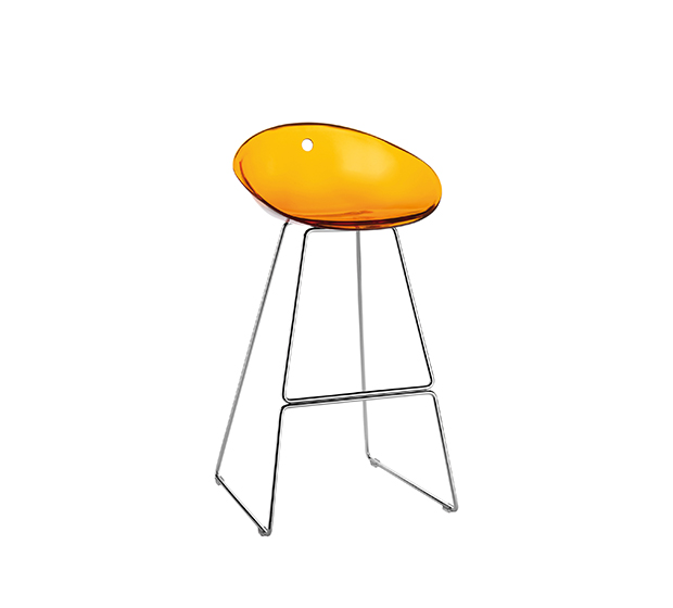 Tabouret hauteur bar. Assise et dossier en polycarbonate, structure tubulaire ronde en acier chromé ou peint.