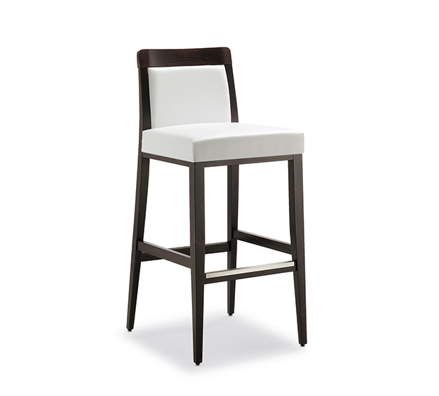 Tabouret hauteur bar. Assise et dossier rembourrés, structure en hêtre fini aniline, laqué ou antique.