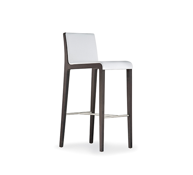 Tabouret hauteur bar. Assise et dossier rembourrés, structure en chêne massif.
