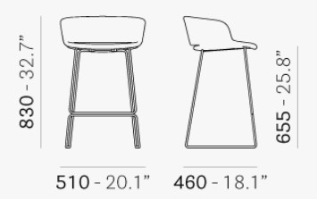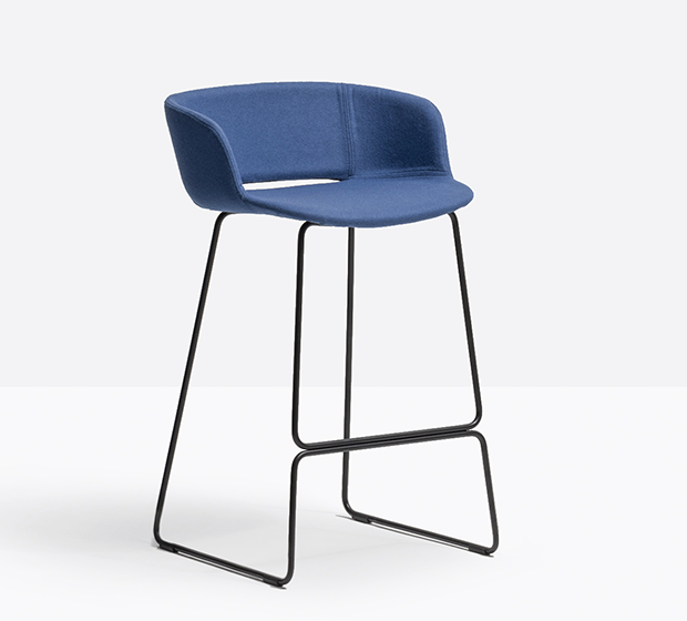 Tabouret hauteur comptoir. Assise et dossier rembourrés. Structure traineau en fil d’acier.
