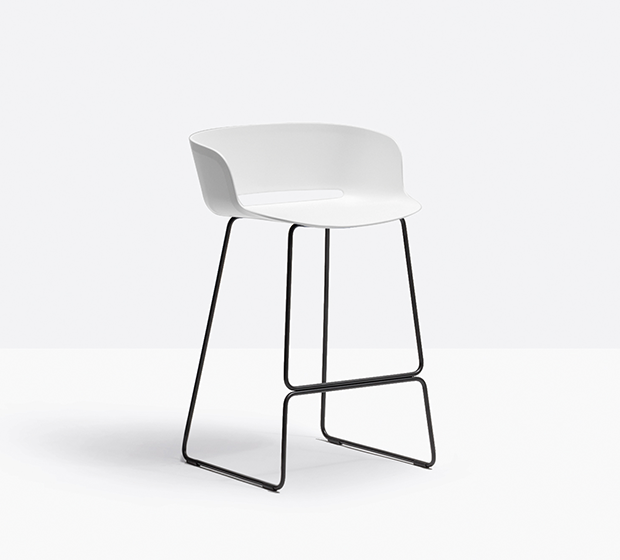 Tabouret hauteur comptoir. Assise et dossier en polypropylène. Structure traineau en fil d’acier.