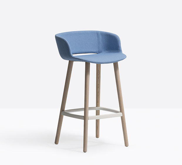 Tabouret hauteur comptoir. Assise et dossier rembourrés. Structure en frêne et repose-pied en aluminium.