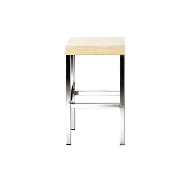 Tabouret hauteur comptoir. Assise en bois, structure tubulaire carrée en acier chromé ou satiné.