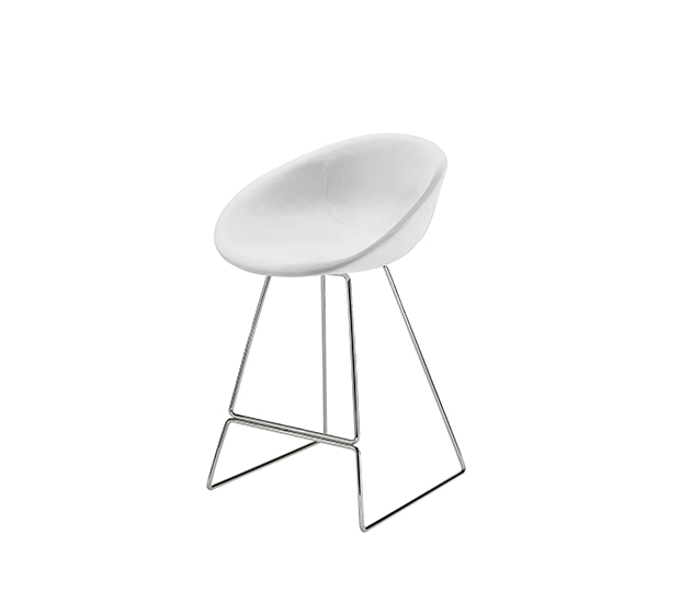 Tabouret hauteur comptoir. Assise et dossier rembourrés, structure tubulaire ronde en acier chromé ou peint.