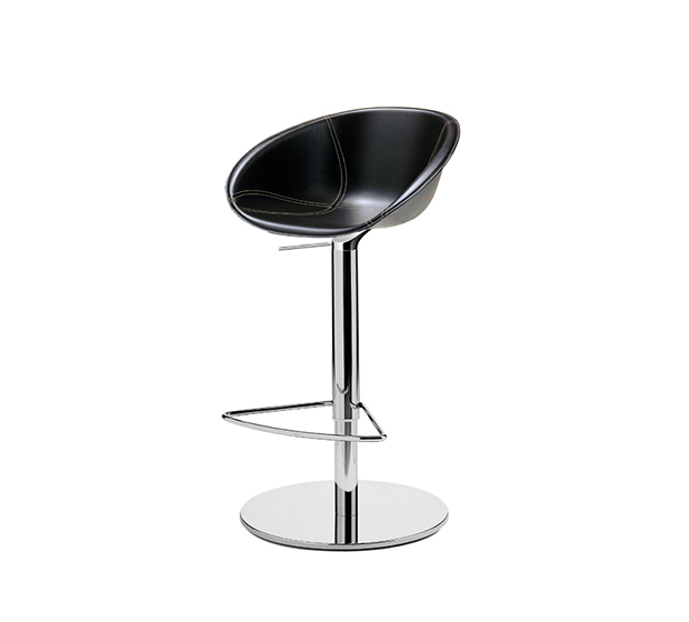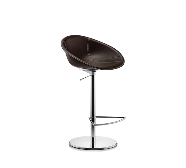 Tabouret à base centrale pivotante et hauteur ajustable. Assise et dossier en cuir véritable, tube et plaque centrale ronds en acier chromé.