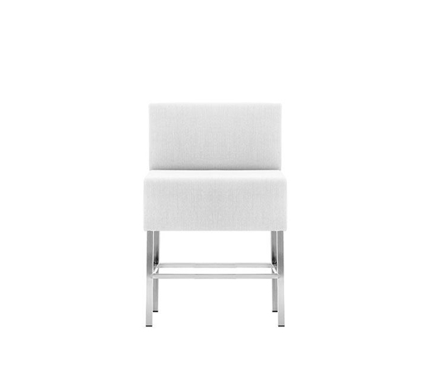 Fauteuil modulaire hauteur comptoir. Élément simple, assise et dossier rembourrés, structure tubulaire carrée en acier chromé ou peint. Paire d’unités de liaison incluse.