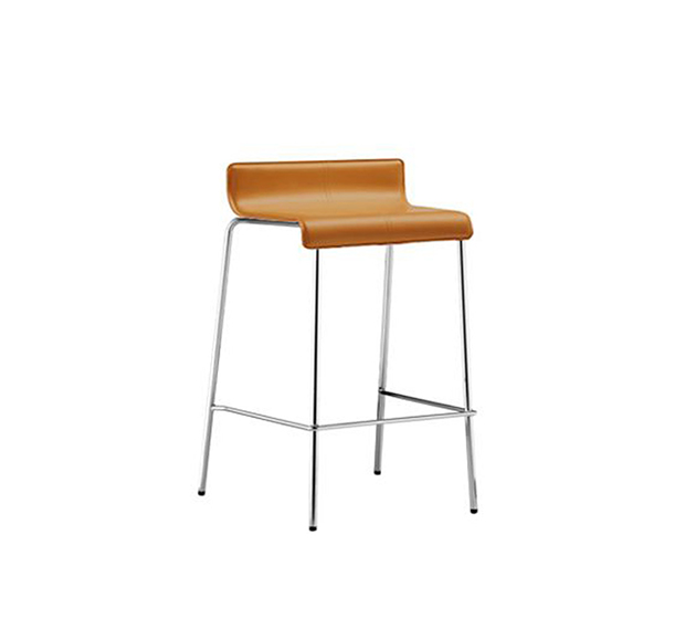 Tabouret hauteur comptoir. Assise et dossier rembourrés en cuir ou en cuir régénéré avec coutures visibles, structure tubulaire ronde en acier chromé, mat ou peint argent.