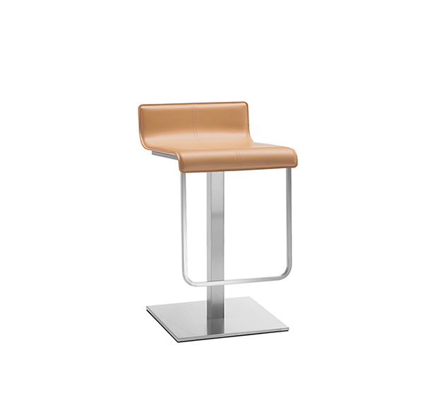 Tabouret hauteur comptoir, à base centrale pivotante. Assise et dossier rembourrés en cuir véritable ou régénéré avec coutures visibles, structure en acier satiné.
