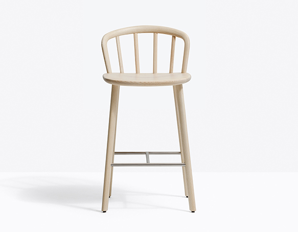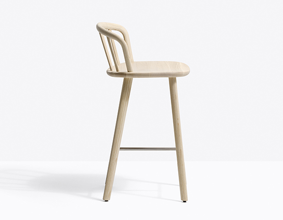 Tabouret hauteur comptoir. Dossier en bois courbé, assise en bois massif. Structure à quatre pattes en frêne massif, repose-pieds en acier inoxydable.