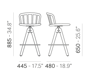 Tabouret pivotant, hauteur comptoir. Dossier en bois courbé, assise en bois massif. Structure à tréteau en frêne massif, repose-pieds circulaire en acier.